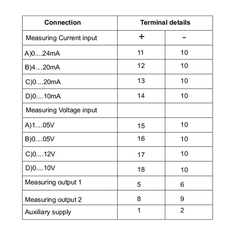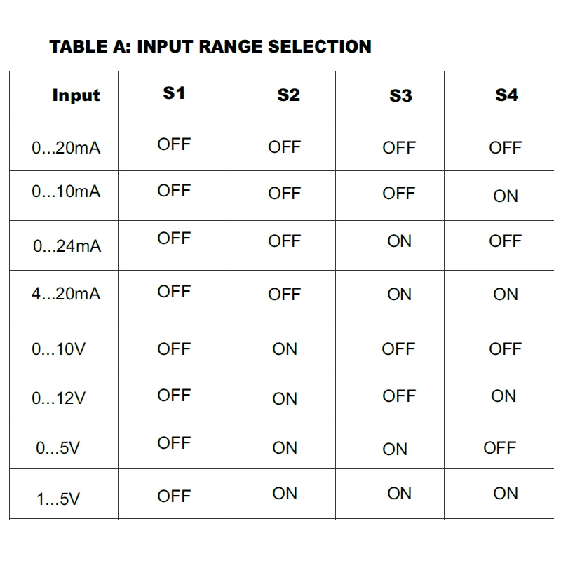 از ۰ تا ۲۰ میلی آمپر ، ۰ تا ۱۰ میلی آمپر، ۴ تا ۲۰ میلی آمپر و۰ تا ۲۴ میلی آمپر (مقاومت ورودی < ۱۵.۵ اهم)