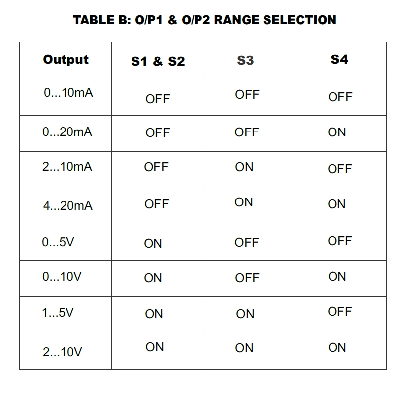 ورودی و خروجی این محصول به وسیله کلیدهای slide قابل تنظیم می باشد. برای کالیبره کردن مقادیرخروجی های ۱ و ۲ به صورت مجزا ، می توان از پتانسیومترهای Z و S که بر روی دستگاه تعبیه شده است استفاده کرد.جداول A و B به ترتیب اطلاعات مربوط به وضعیت کلیدها، برای تنظیم کردن ورودی و خروجی های۱ و ۲ را نشان می دهد.برخی ویژگی های ایزولاتورdc قابل برنامه ریزی دوخروجی ،به شرح زیر می باشد :