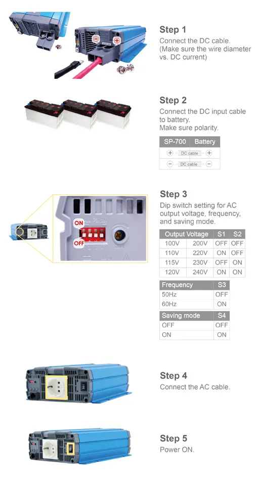 اینورترهای سری جدید کوتک (COTEK) که با نام SP شناخته می شوند، دارای قابلیت های جدیدی نسبت به مدل های قدیمی SK می باشند که از جمله این قابلیت ها می توان به انتخاب کردن ولتاژ خروجی توسط DIP SWITCH طراحی شده بر روی دستگاه اینورتر اشاره کرد.توسط این DIP SWITCH شما میتوانید ولتاژ خروجی را بر روی ۲۰۰ ولت، ۲۲۰ولت، ۲۳۰ ولت و ۲۴۰ ولت تنظیم نمایید.